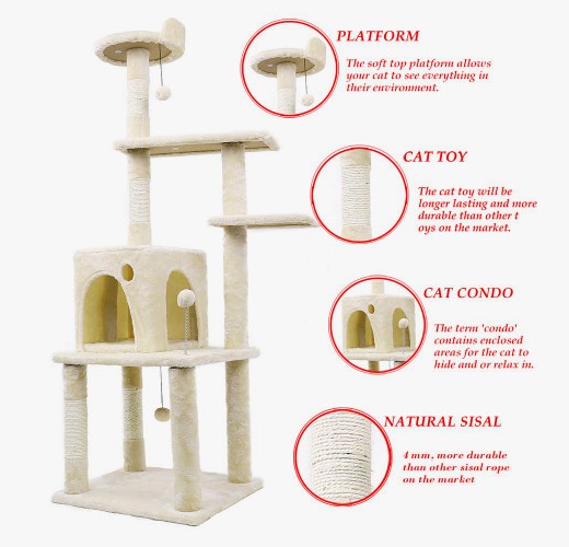 | Vakker og behagelig | Den naturlige tekstur og farge på miljøvennlig tre gir en varm og naturlig atmosfære til tretårnet Cat Tree Climbing Frame, og gir et varmt og behagelig hvilemiljø for katter |